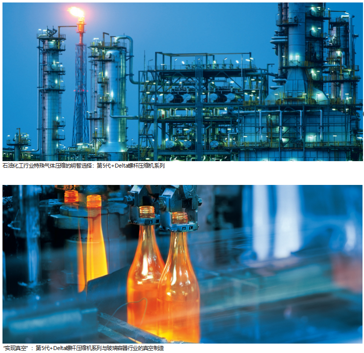 另一功能: 第五+代螺杆压缩机可选配专用转子叶型 ,进一步提高灵活度。 低压无油螺杆压缩机为 3+4 叶型 ,是压力比为3 (压力与进气压力)以内的应用的理想选择。这意味着,它们也是 70% 以内真空(0.33 bar 压力)负压应用的选择。 专用的预进气设备可实现高达 85% 的真空(0.15 bar 压力)。
